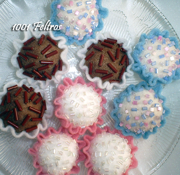 Brigadeiros de feltro para enfeitar e também um chaveirinho.