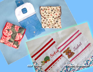 Três porta carregadores de celular utilíssimos, e as toalhinhas bordadas em ponto cruz, com bolsos, para as crianças!! Amei tudinho....