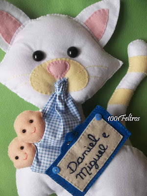 Desta vez um gatinho cegonha, uma gatinha na verdade, apresentando aos amigos e familiares os gêmeos Daniel, e Miguel.